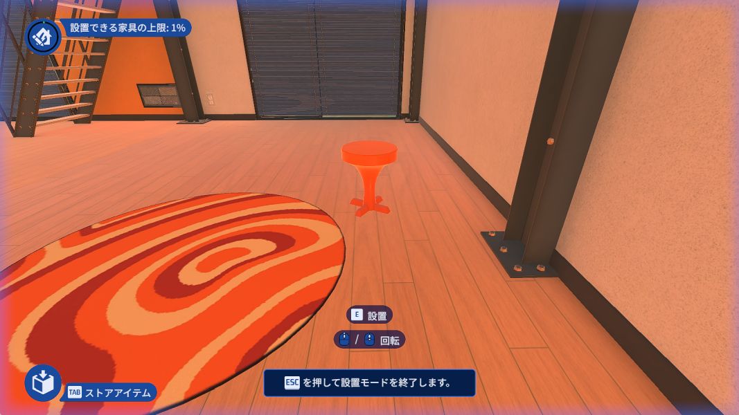 購入した家具を[Tabキー]で選び、1階で洗ってからどこかに設置することで実績達成です。