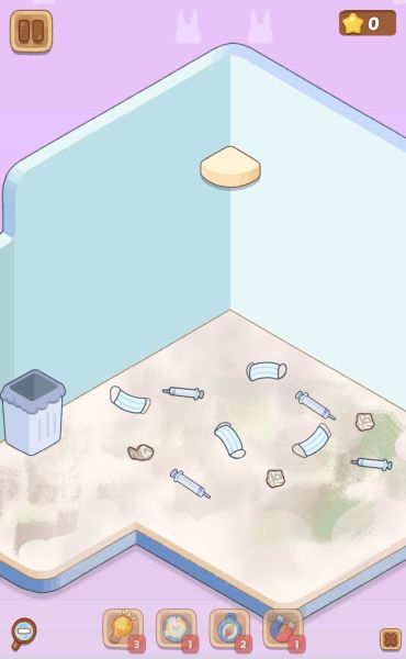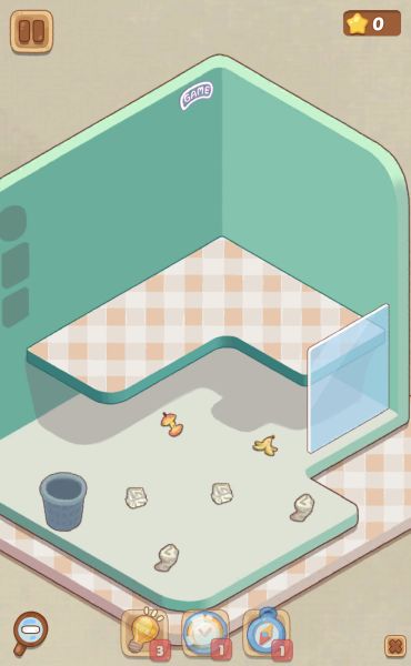 このレベルの最初に、ゴミが落ちているので左にあるゴミ箱に全て捨てる必要があります。