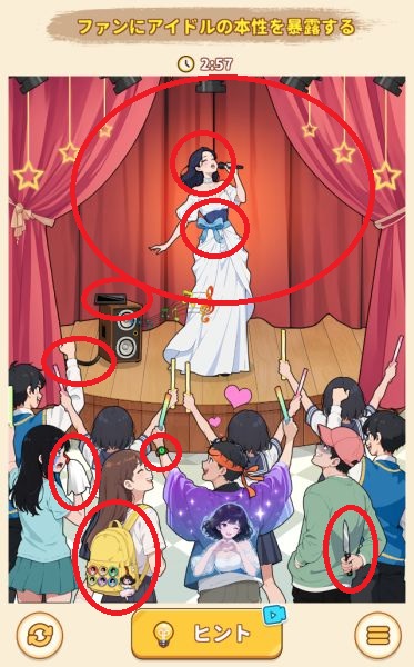 - 左下の泣いているファンの持つ白いハンカチをアイドルの顔に使う