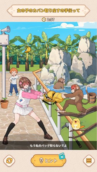 サルにバッグを取られないように女の子を助けてあげましょう。