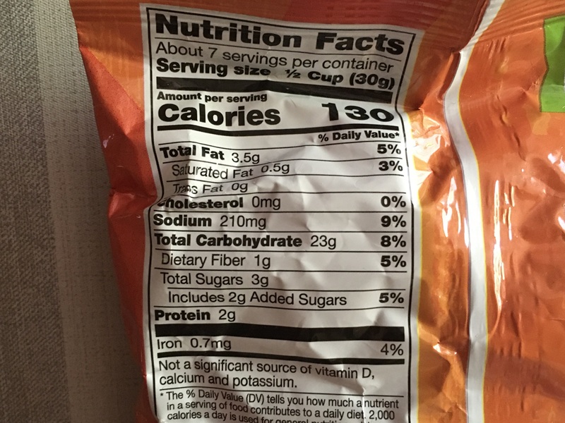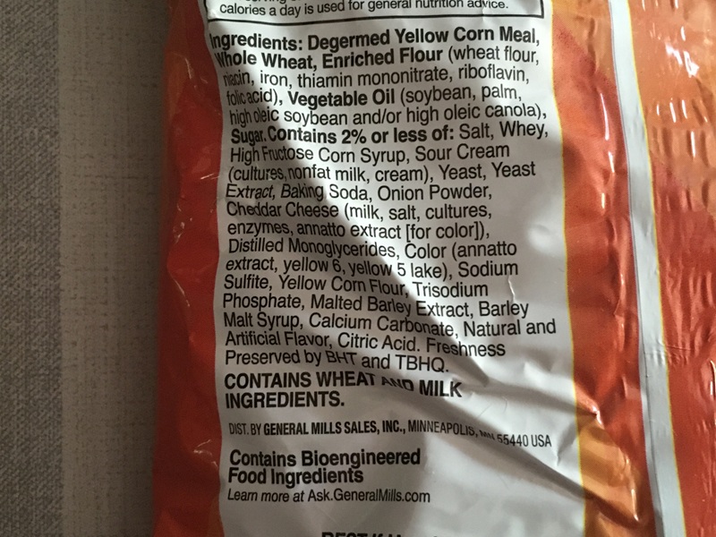 胚芽除去イエローコーンミール、全粒小麦、栄養強化小麦粉(小麦粉、ナイアシン、鉄、硝酸チアミン、リボフラビン、葉酸)、植物油(大豆油、パーム油、高オレイン酸大豆油、高オレイン酸キャノーラ油)、砂糖、以降2%以下含有:塩、ホエイ、果糖ぶどう糖液糖、サワークリーム(培養物、無脂肪乳、クリーム)、イースト、酵母エキス、重曹、オニオンパウダー、チェダーチーズ(牛乳、塩、培養物、酵素、アナトーエキス[着色料])、蒸留モノグリセリド、着色料(アナトーエキス、黄6、黄5レーキ)、亜硫酸ナトリウム、イエローコーンフラワー、リン酸三ナトリウム、麦芽大麦エキス、大麦麦芽シロップ、炭酸カルシウム、天然香料、人工香料、BHT(保存料)、TBHQ(保存料)
