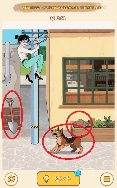 - 左のショベルを使って花壇の土の山を掘り、出てきた骨を犬に渡す