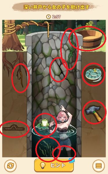 - 井戸の中の蛙を上にスワイプして舌を伸ばし、カエルをロープに繋ぐ