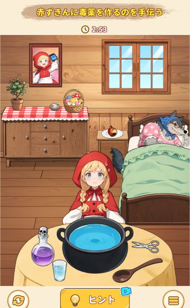 - 左上の赤ずきんちゃんの絵の持つ何か(スマホ?)をスープに入れる