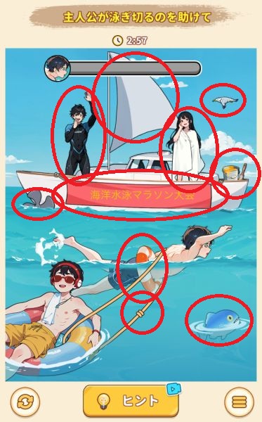 水泳大会で男性が泳ぎ切れるように助けてあげましょう。