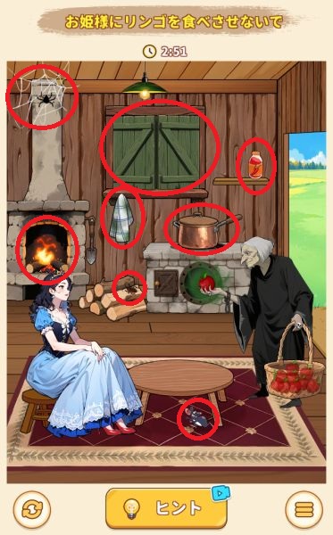 - 暖炉の右にある緑の煙の出ているタオルをりんごに使う