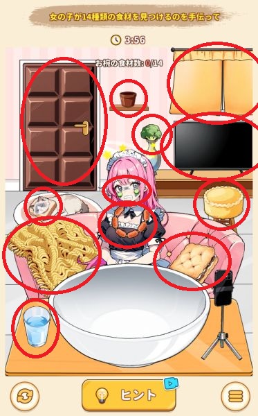- ドアの右とテーブルの右下にあるゴミを右のゴミ箱に捨てる