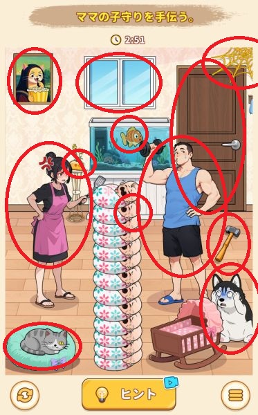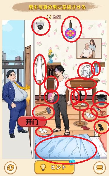 - 右上のドアを左にスワイプして開け、出てきた男性に右のハンマーを使って追い払う