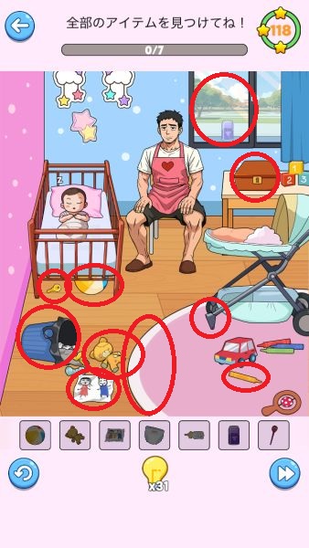 下のアイテム欄にあるアイテムを、赤ちゃんのお部屋の中から全て見つけましょう。