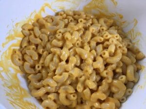 - 湯切りしたマカロニを鍋に戻し、チーズソースを入れてよく混ぜ合わせる。