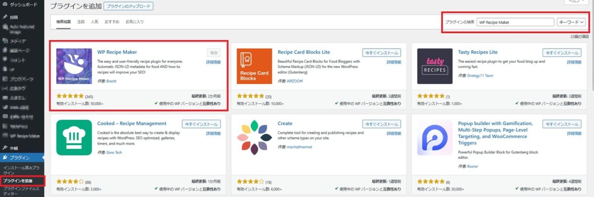 WordPress管理画面の左にある「プラグイン」→「プラグインを追加」から、右上の検索欄に「WP Recipe Maker」と入力しましょう。