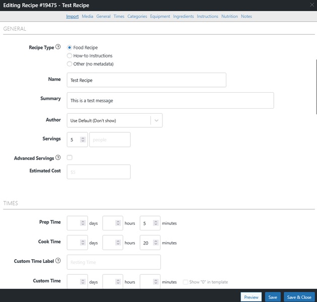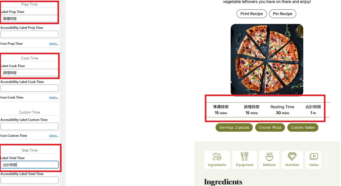 | Times | 調理時間を入力します。 Prep Time:準備時間 Cook Time:調理時間 Custom Time Label:カスタム時間名(焼き時間 など独自に入力可能) Custom Time:カスタム時間 Total Time:合計時間 ※合計は下に出る[Recalculate Total Time]から自動で計算してくれます。 |