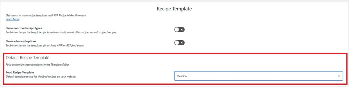 管理画面左の[WP Recipe Maker]→[Settings]を開き、少し下の方にある[Recipe Template]の下の項目[Default Recipe Template]を先ほど設定したテンプレート名に設定しましょう。