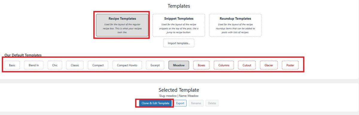 管理画面左の[WP Recipe Maker]→[Template Editor]でテンプレートの編集が行えます。