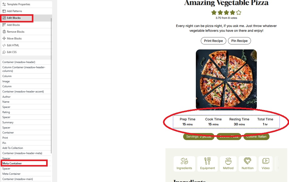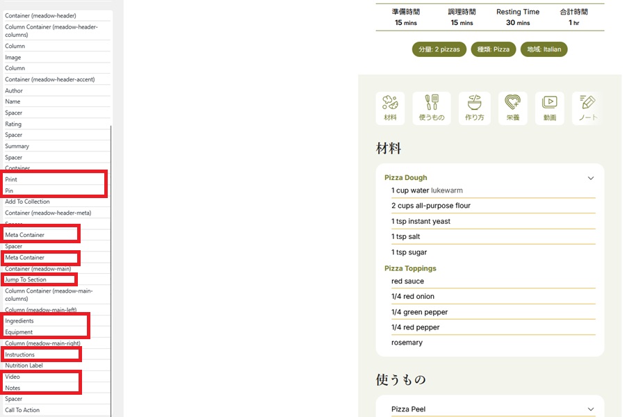 - Meta Container(2つ目):何人前(Servings)・種類(Course)などの文字