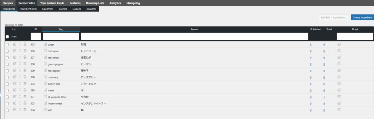 WordPress管理画面の左にある[WP Recipe Maker]→[Manage]からレシピや材料などの設定を行える画面に行けます。