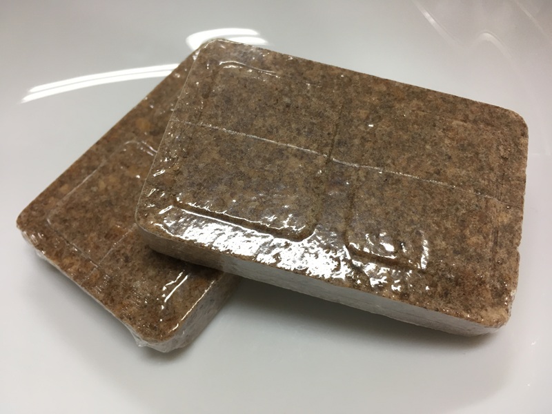パッケージは真空パックになっており、中にブロック状の压缩干粮が2個入っています。