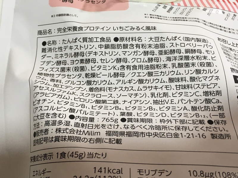 大豆たんぱく(国内製造)、難消化性デキストリン、中鎖脂肪酸含有粉末油脂、ストロベリーパウダー、ミネラル酵母(デキストリン、マンガン酵母、亜鉛酵母、銅酵母、モリブデン酵母、ヨウ素酵母、セレン酵母、クロム酵母)、海洋深層水粉末、ビフィズス菌末(殺菌)、ビタミンK2含有食用油脂粉末、乳酸菌末(殺菌)、植物性プラセンタ、乾燥ビール酵母/クエン酸三カリウム、リン酸カルシウム、香料、グルコン酸カリウム、アルギン酸カリウム、酸味料、酸化マグネシウム、加工デンプン、着色料(モナスカス、ムラサキイモ)、甘味料(ステビア、アセスルファムK、スクラロース、ソーマチン)、乳化剤、ビタミンC、増粘剤(アラビアガム)、ピロリン酸第二鉄、ナイアシン、抽出V.E、パントテン酸Ca、ビオチン、ビタミンB1、ビタミンB6、ビタミンB2、ビタミンA、酸化防止剤(アスコルビン酸パルミテート)、葉酸、ビタミンD、ビタミンB12、(一部に大豆を含む)