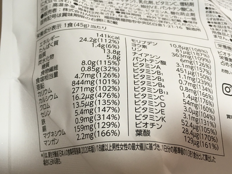 完全食の標準的な条件と思われる、1日の基準値の1/3以上のタンパク質やビタミン・ミネラルなどの大半が摂れる点は他の完全食とあまり差はありません。
