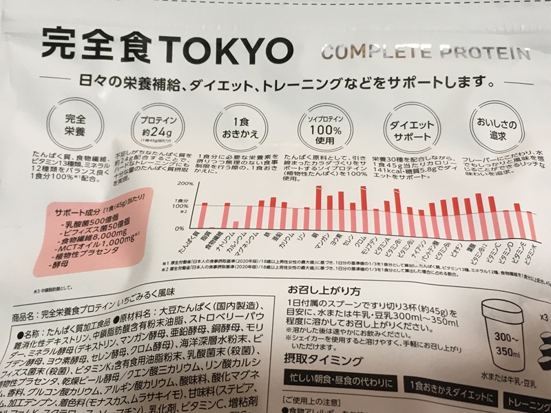 また、追加で「完全食TOKYO いちごみるく風味」(ソイプロテイン)も購入したので、後半に使ってみた感想と味についてまとめています。