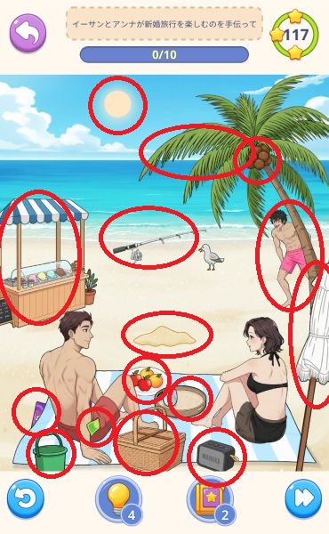 - 右上のヤシの実を2人の間にあるトレーに置く