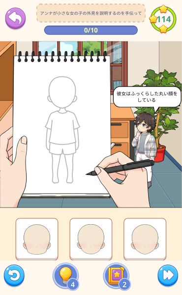 息子が見かけたという女の子の特徴を聞き、アンナが正しく女の子の絵を描くのを助けましょう。