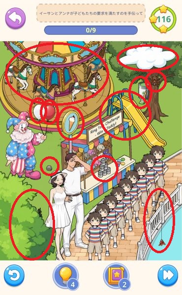 - 左のピエロの持っている赤い風船を男の子に渡す
