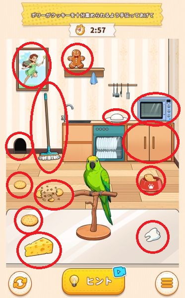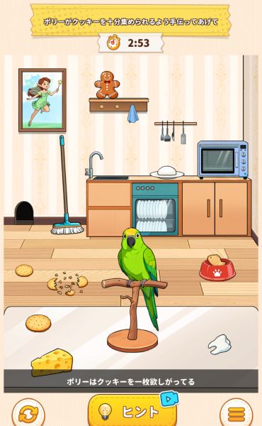 オウムのポリーが部屋中のクッキーを全て集められるようにしましょう。