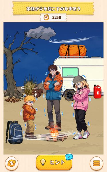 - 右上の車の屋根にある荷物をタップして開け、中の帽子を火に使う
