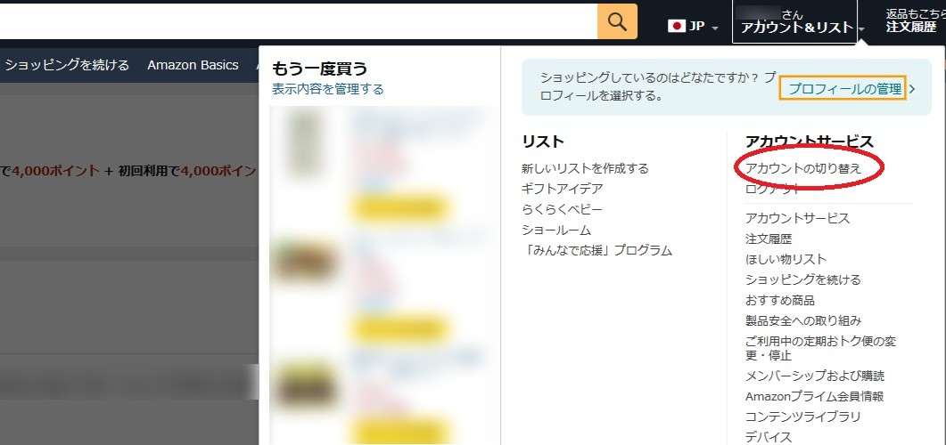 アカウントを切り替えるには、右上の「XXさん アカウント&リスト」の中にある、アカウントサービスの「アカウントの切り替え」から行えます。