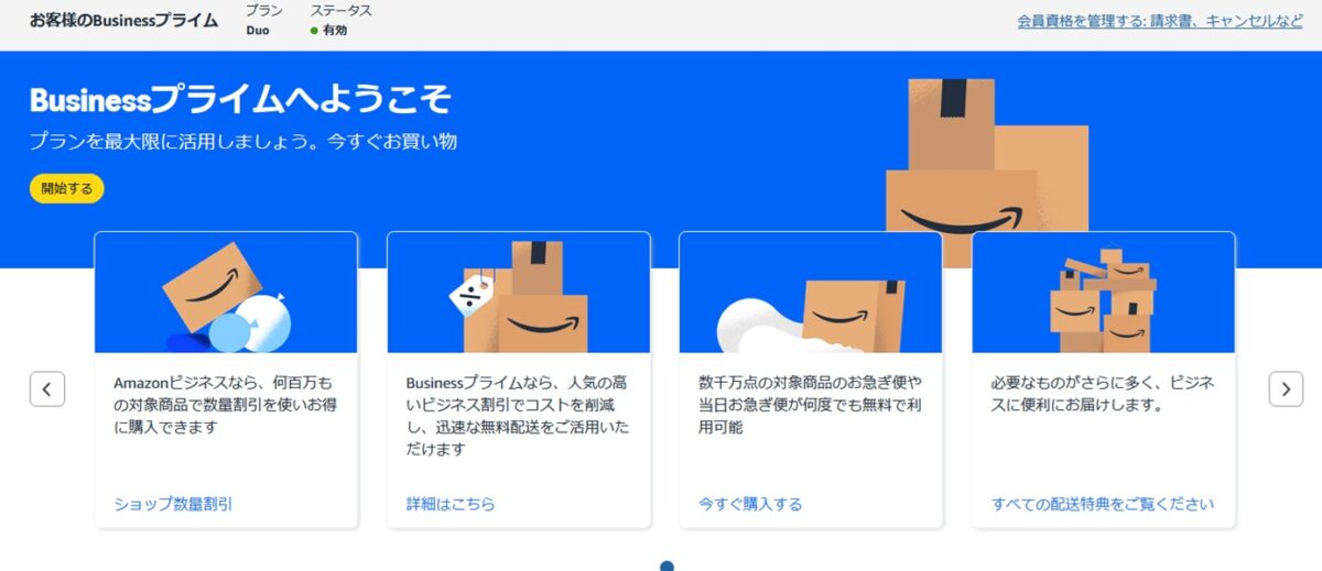 Amazonビジネスアカウントでは、個人用のAmazonプライムの特典は使えませんが、「BusinessプライムDuo」という年会費無料のビジネス向けプライム特典が利用できます。