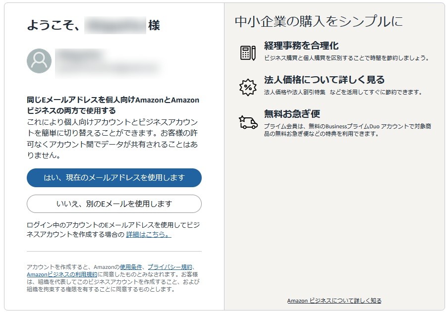 個人用アカウントと同じメールアドレスで登録する場合は、青いボタン「はい、現在のメールアドレスを使用します」を選べば次に進みます。