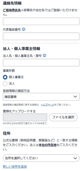 - 連絡先情報:個人事業主であれば自分の名前・電話番号を入力します