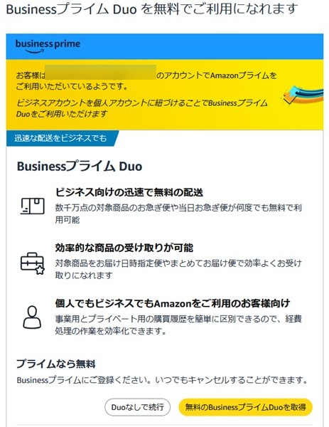次に、個人用アカウントでプライム会員であれば、「Business プライム Duo」を使うかどうか聞かれます。