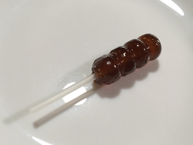 京京樂道ブランドのグミで、「だんご型グミ」というだけあってプラスチックの串にグミが刺さっています。