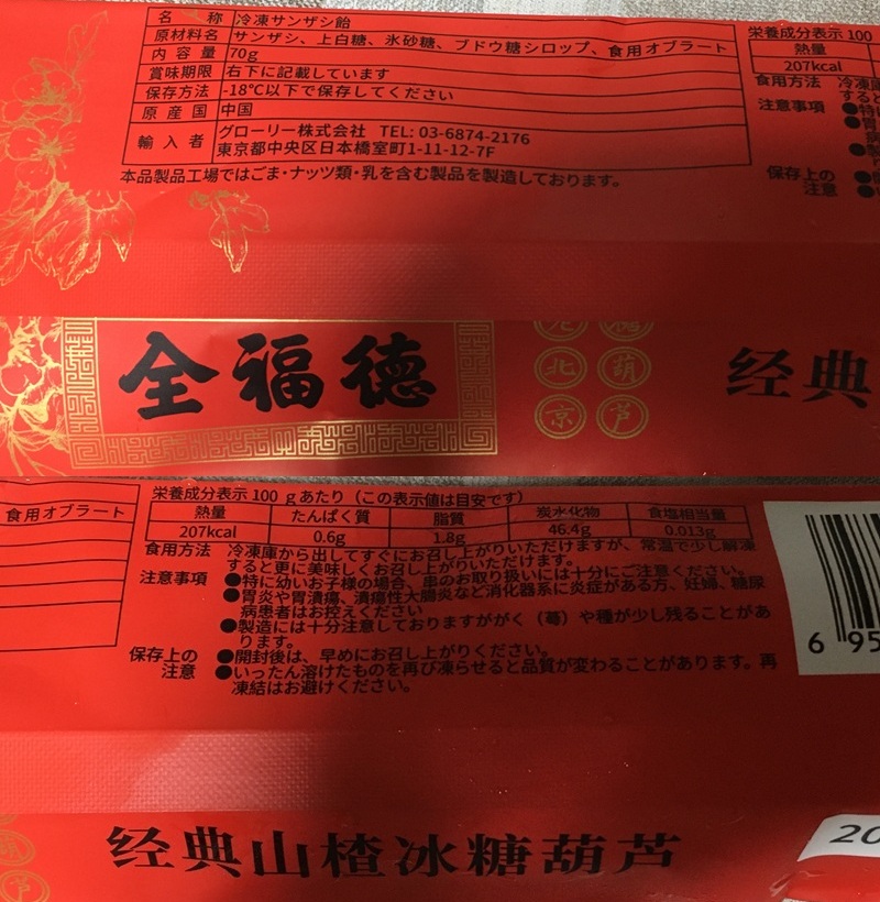 「全福徳 经典山楂冰糖葫芦」(全福徳 昔ながらの山楂冰糖葫芦)は、中国メーカーで製造、グローリー株式会社が輸入・販売する冷凍の糖葫芦です。