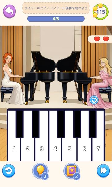 ライリーがピアノコンクールで勝てるように正しい順番で鍵盤をタップしましょう。