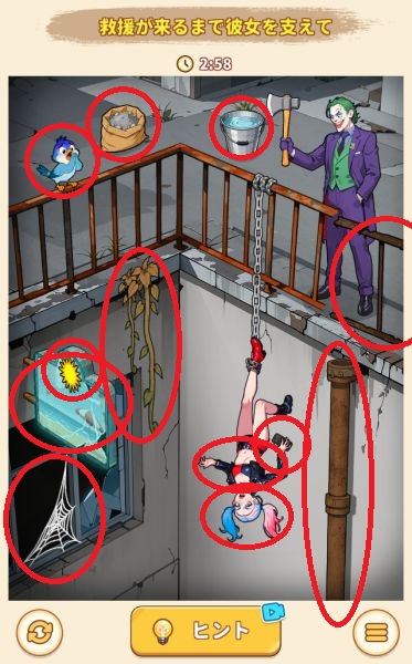 ジョーカーらしき人に落とされそうになっているハーレイクインっぽい人が落ちないように助けましょう。