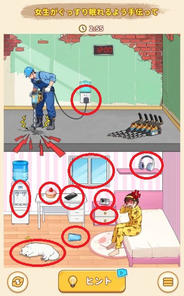 下の階の女性が寝れるように作業を妨害するなどして時間を進めましょう。
