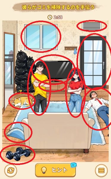 - ゴミ袋を立っている男性に2つと女性と右で寝ている男性にそれぞれ渡す