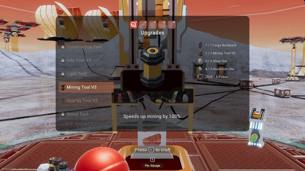 | Mining Tool V2 | Medium Backpack Mining Tool V1 Copper Ore x2 Silica Ore x1 Power x5 | 採掘速度50%アップ |