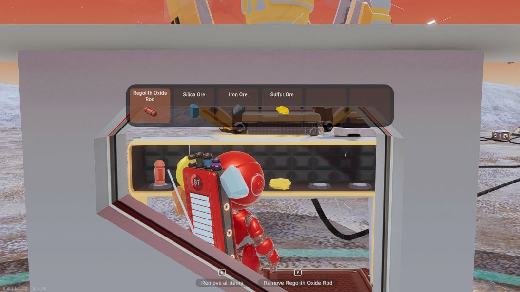 | Fuel Generator T1 | Composite Metal x1 Copper Wire x1 Power x5 | 発電量:1.0/sec 燃料ソケット数:2 燃料:Regolith Oxide Rod | 序盤に落ちているブループリント |