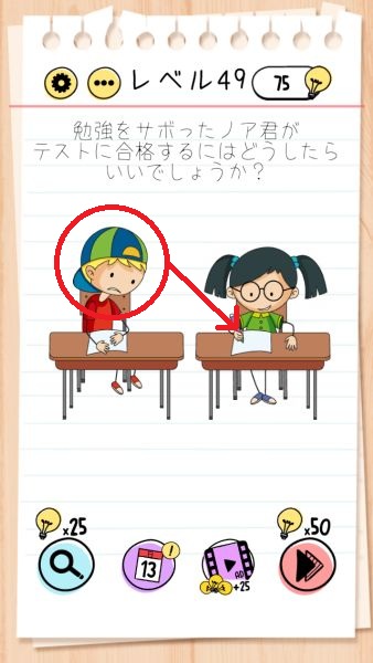 - 左の男の子(ノア君)の首を右に動かして伸ばしカンニングさせる