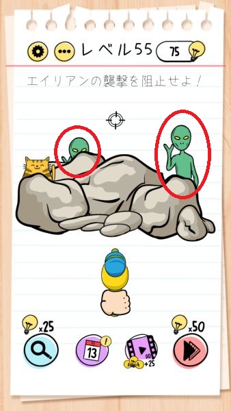 - 岩から出てくる宇宙人のみをタップして全員倒す