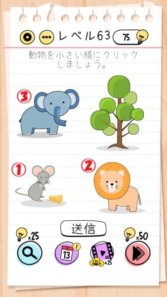 レベル63(動物を小さい順にタップ)