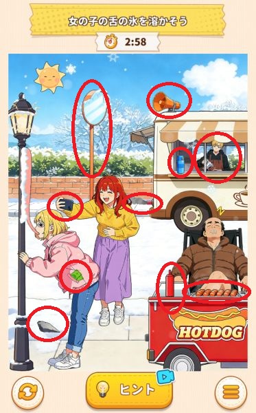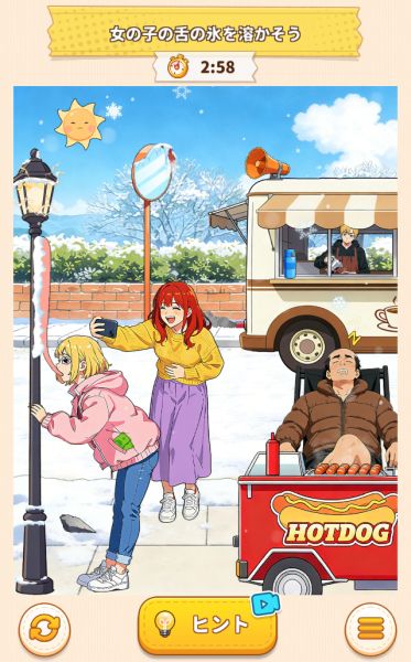 奥の黄色い上着の女性を動かして舌に使ってしまうとゲームオーバーでした。