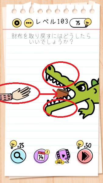 - ワニの口を2本指で長押ししながら左の手を口の中の財布のところに動かす