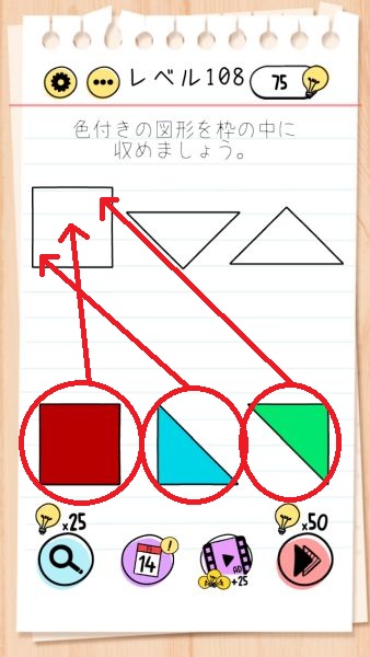- 青い三角形を赤い四角の左下に重なるように動かす