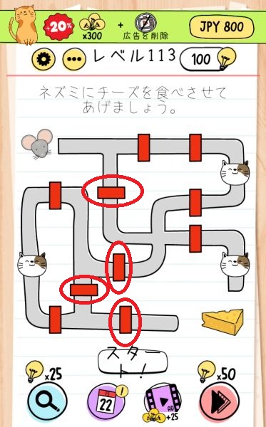 - ネズミからチーズまでの道の途中にある赤い門をタップして開ける