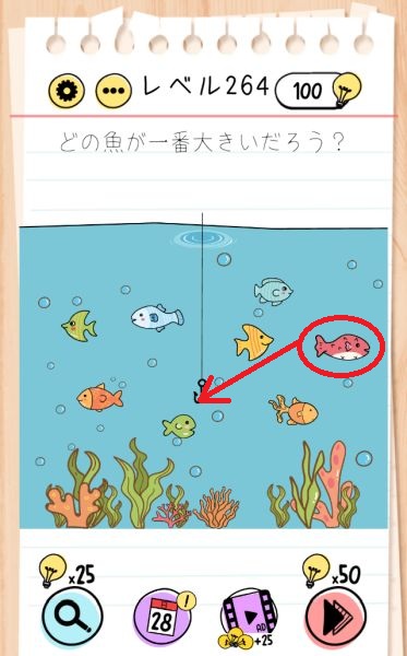 - 右にいる赤いお魚を釣り針のところに動かして膨らませる